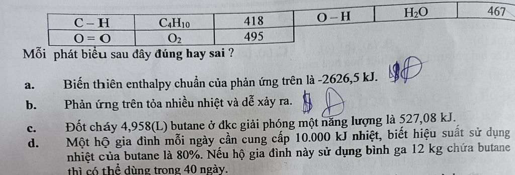 Biến thiên enthalpy chuẩn của phản ứng trên là -2626,5 ki. Đ