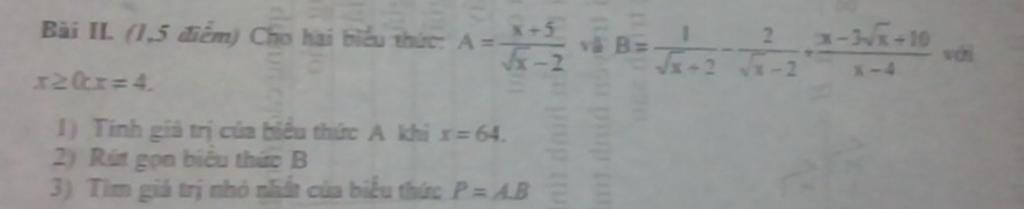 `B = ((\sqrt(x)-2) - 2(\sqrt(x)+2) + x - 3\sqrt(x) + 10)/(x-4) = (x - 4\sqrt(x) + 4)/(x-4) = ((\sqrt(x)-2)^2)/((\sqrt(x)-2)(\sqrt(x)+2)) = (\sqrt(x)-2)/(\sqrt(x)+2)`