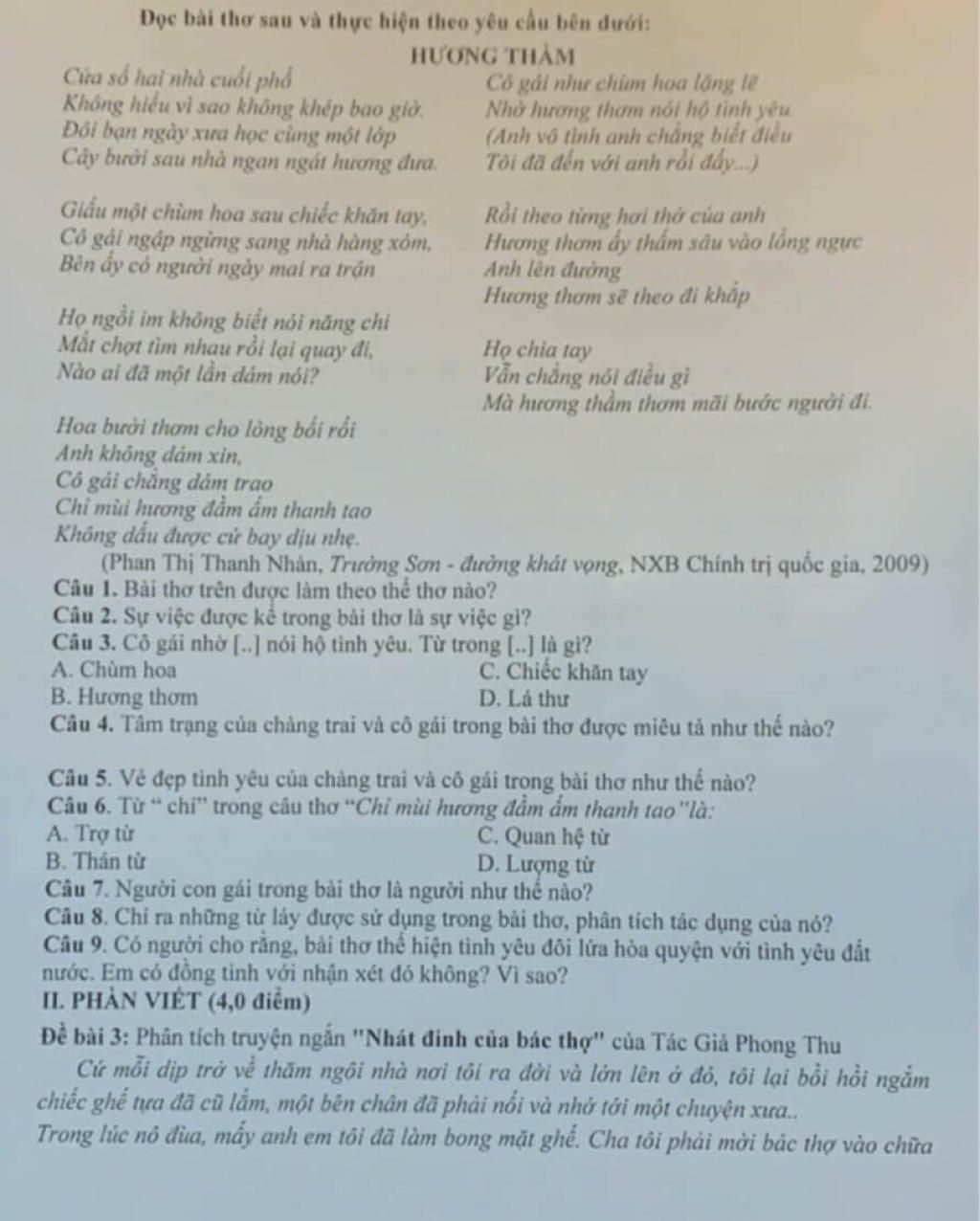 C9:Có người cho rằng bài thơ thể hiện tình yêu đôi lứa hoà quyện với tình yêu đất nước.Em đồng tình với nhận xét đó vì bài thơ không chỉ nói về tình yêu cá nhân mà còn phản ánh tâm tư hình ảnh của những người trẻ trong bối cảnh đất nước có chiến tranh thể hiện sự gắn kết giữa tình ye eu và trách nhiệm với quê hương.