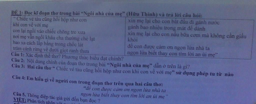 Câu 5: Qua đoạn thơ, tác giả muốn nhắn nhủ đến người đọc thông điệp rằng hãy biết yêu thương mẹ, trân trọng và biết ơn, làm những việc mẹ vui lòng.