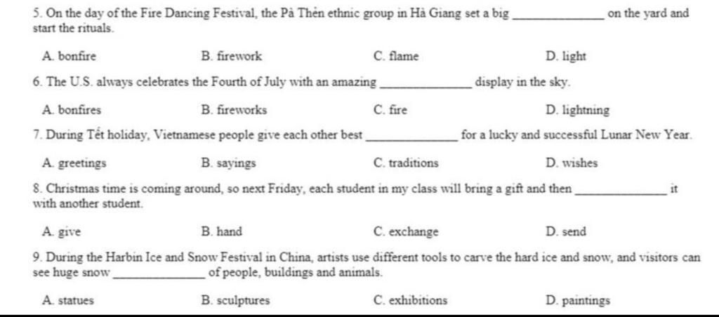 7. During Tết holiday, Vietnamese people give each other best wishes for a lucky and successful Lunar New Year. (D. wishes)