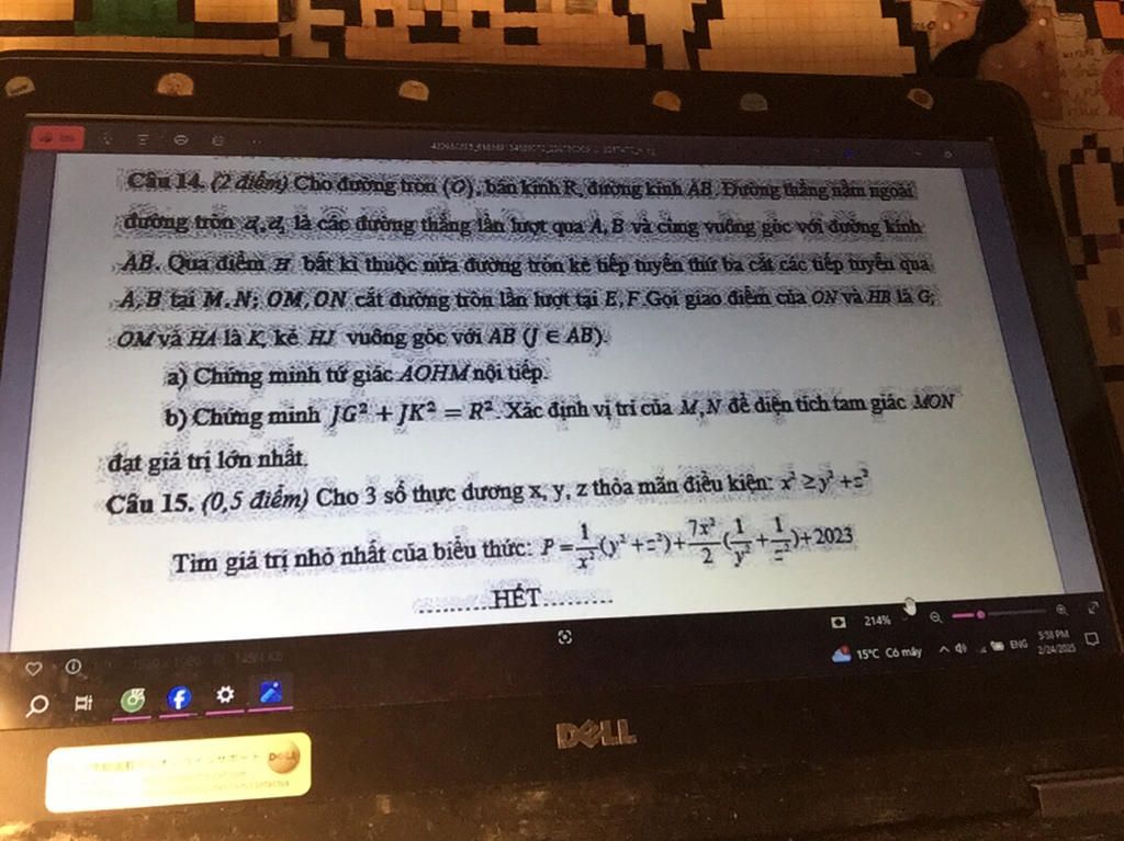 Câu 14. (2 điểng Cho đường tròn (O), bán kính R đường kinh AB. Đường thẳng nằm ngoài