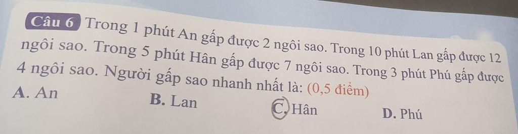 Từ trên, ta thấy An gấp được nhiều ngôi sao nhất trong cùng một khoảng thời gian với `3` bạn còn lại hay An gấp nhanh nhất
