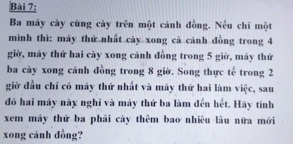 Thời gian máy thứ ba cần cày là : $\frac{1}{10}$ : $\frac{1}{8}$ = $\frac{4}{5}$