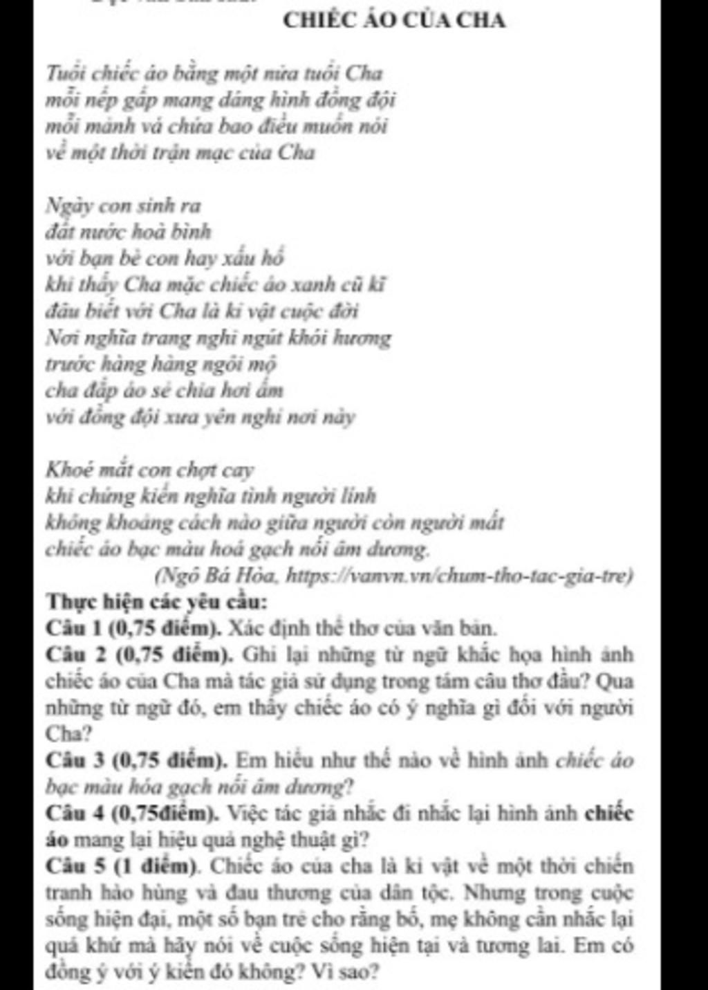 Có ý kiến cho rằng: "Chiếc áo của cha là kỉ vật về một thời chiến tranh hào hùng và đau thương của dân tộc. Nhưng trong cuộc sống hiện tại, một số bạn cho rằng, họ không cần nhắc lại quá khứ mà chỉ nên tập trung vào cuộc sống hiện tại và tương lai". Tôi không đồng ý với quan điểm này, bởi lẽ quá khứ là một phần không thể thiếu trong hành trình phát triển của mỗi con người cũng như của dân tộc. Trước hết, quá khứ là nền tảng để con người trân trọng hiện tại. Nếu không có những hy sinh gian khổ của thế hệ cha ông, liệu chúng ta có thể có được cuộc sống hòa bình, đủ đầy như ngày hôm nay? Việc nhớ về quá khứ không có nghĩa là chìm đắm trong nỗi đau, mà là để tri ân, để biết ơn và sống có trách nhiệm hơn với những gì mình đang có. Những người lính đã hy sinh, những kỷ vật còn sót lại như chiếc áo của Cha không đơn thuần chỉ là câu chuyện của một cá nhân, mà còn là biểu tượng của cả một thế hệ anh hùng đã chiến đấu vì Tổ quốc. Bên cạnh đó, việc nhắc lại quá khứ còn giúp định hướng tương lai. Lịch sử luôn chứa đựng những bài học quý giá về lòng yêu nước, sự đoàn kết, tinh thần kiên cường, bất khuất. Nếu thế hệ trẻ chỉ quan tâm đến hiện tại và tương lai mà quên đi những giá trị đã được đánh đổi bằng biết bao xương máu, thì đó sẽ là một thiếu sót lớn. Một dân tộc không biết trân trọng quá khứ của mình thì sẽ khó có thể xây dựng một tương lai vững chắc. Cuối cùng, quá khứ chính là một phần của bản sắc dân tộc. Những câu chuyện về lịch sử, về những con người đã hy sinh vì đất nước không chỉ là nguồn cảm hứng, mà còn là niềm tự hào giúp mỗi người nhận thức rõ hơn về trách nhiệm của bản thân đối với cộng đồng. Nếu chúng ta quên đi quá khứ, đồng nghĩa với việc đánh mất một phần quan trọng của chính mình. Chính vì những lý do trên, tôi không đồng ý với quan điểm cho rằng chúng ta không cần nhắc lại quá khứ. Nhắc lại quá khứ không có nghĩa là sống mãi trong đó, mà là để rút ra bài học, để trân quý hiện tại và hướng tới một tương lai tốt đẹp hơn.