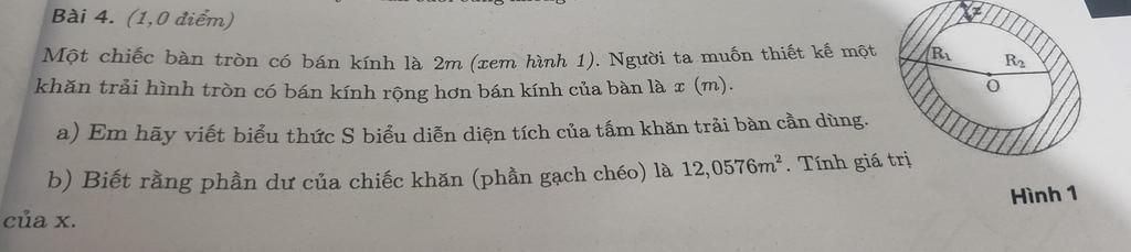 `->` Diện tích tấm khăn trải bàn là: `S=R_2^2\pi=(2-x)^2\pi=(x^2-4x+4)\pi\ (m^2)`