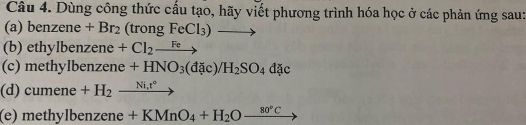 Câu 4. Dùng công thức cấu tạo, hãy viết phương trình hóa học ở các phản ứng sau: