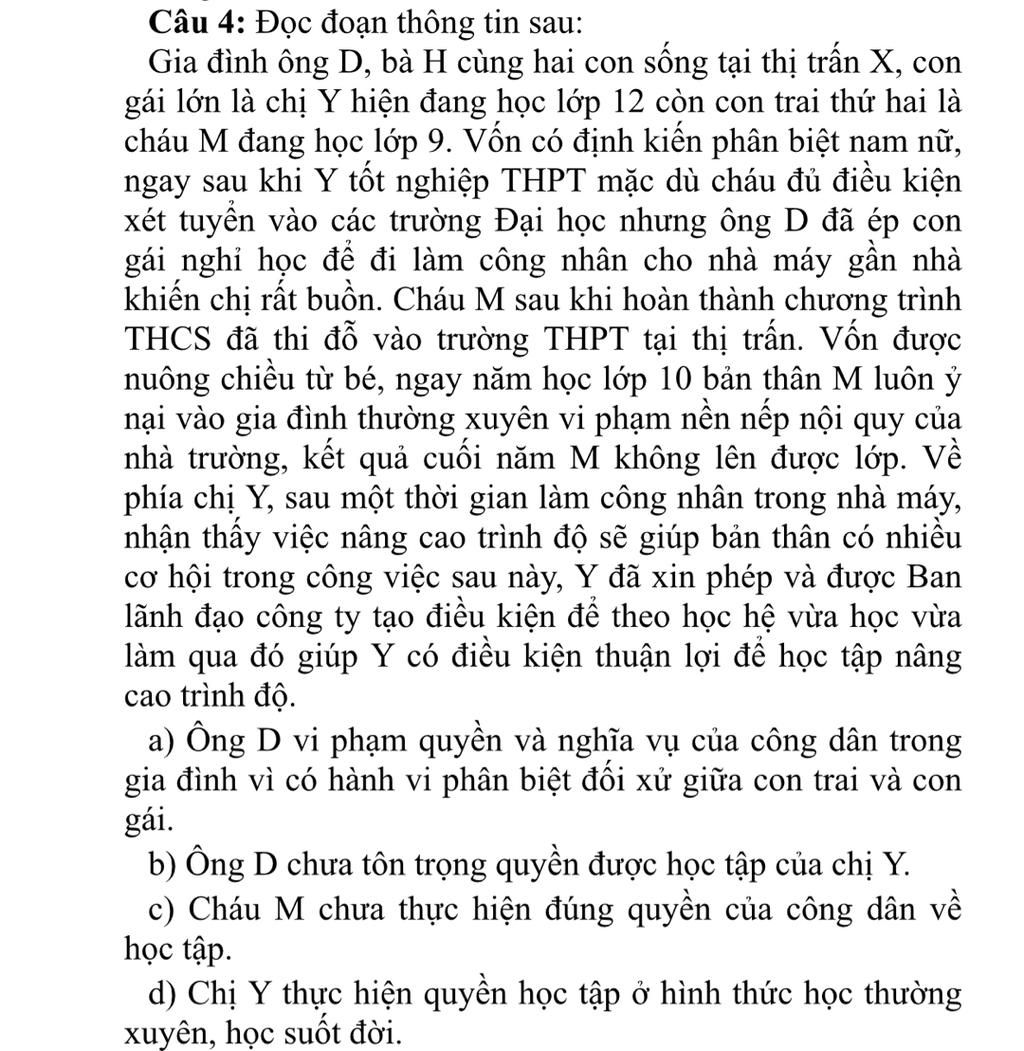 `->` Ông `D` chưa tôn trọng quyền được học tập của chị `Y`, vì đáng lẽ `Y` có thể tiếp tục học nhưng bị ép nghỉ để đi làm công nhân.