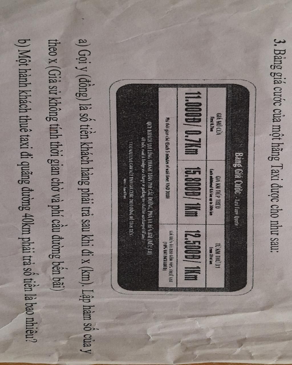 3. Bảng giá cước của một hãng Taxi được cho như sau: