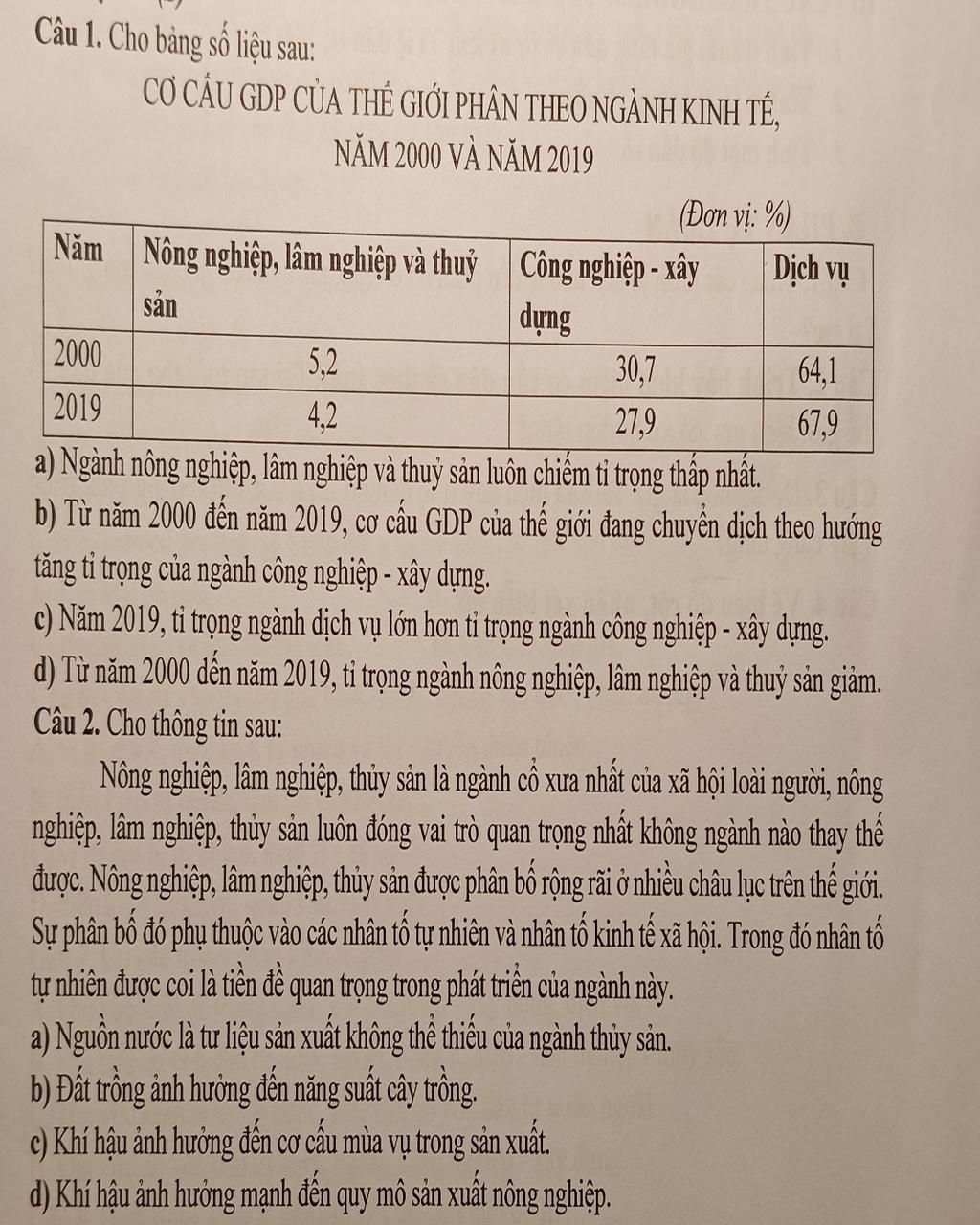 `a)` Đúng. Vì nhìn vào bảng cơ cấu GDP của thế giới phân theo ngành kinh tế nắm `2000` đến `2019,` tỷ trọng ngành Nông-lâm-thuỷ sản đóng góp `5,2%(2000)` và `4,2%(2019).`