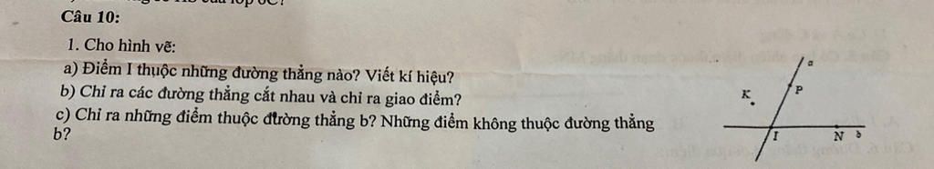 `c`) Những điểm thuộc đường thẳng `b` gồm : điểm `N`, điểm `I`