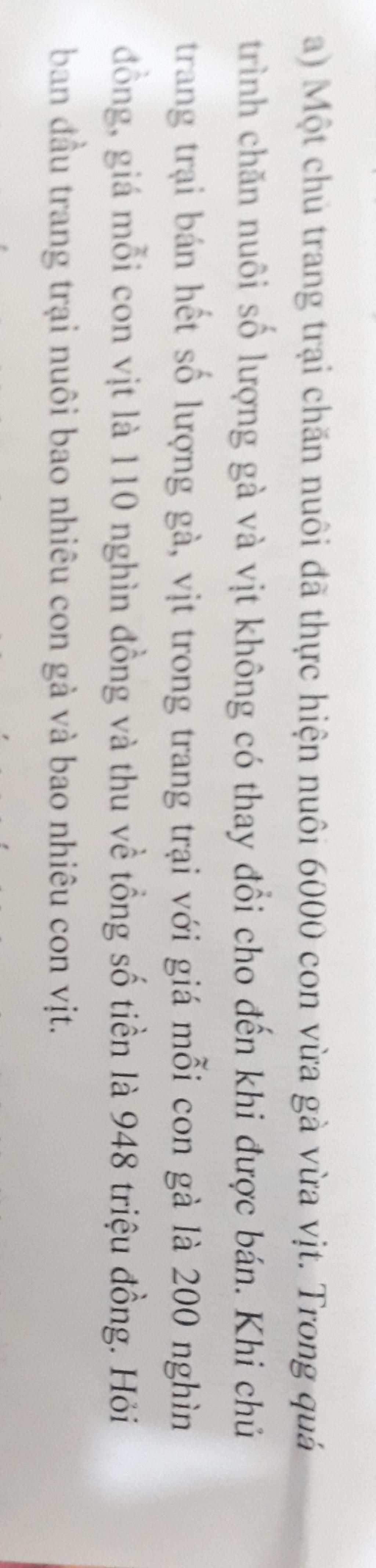 + Nuôi `6000` con gà và vịt nên ta có pt :