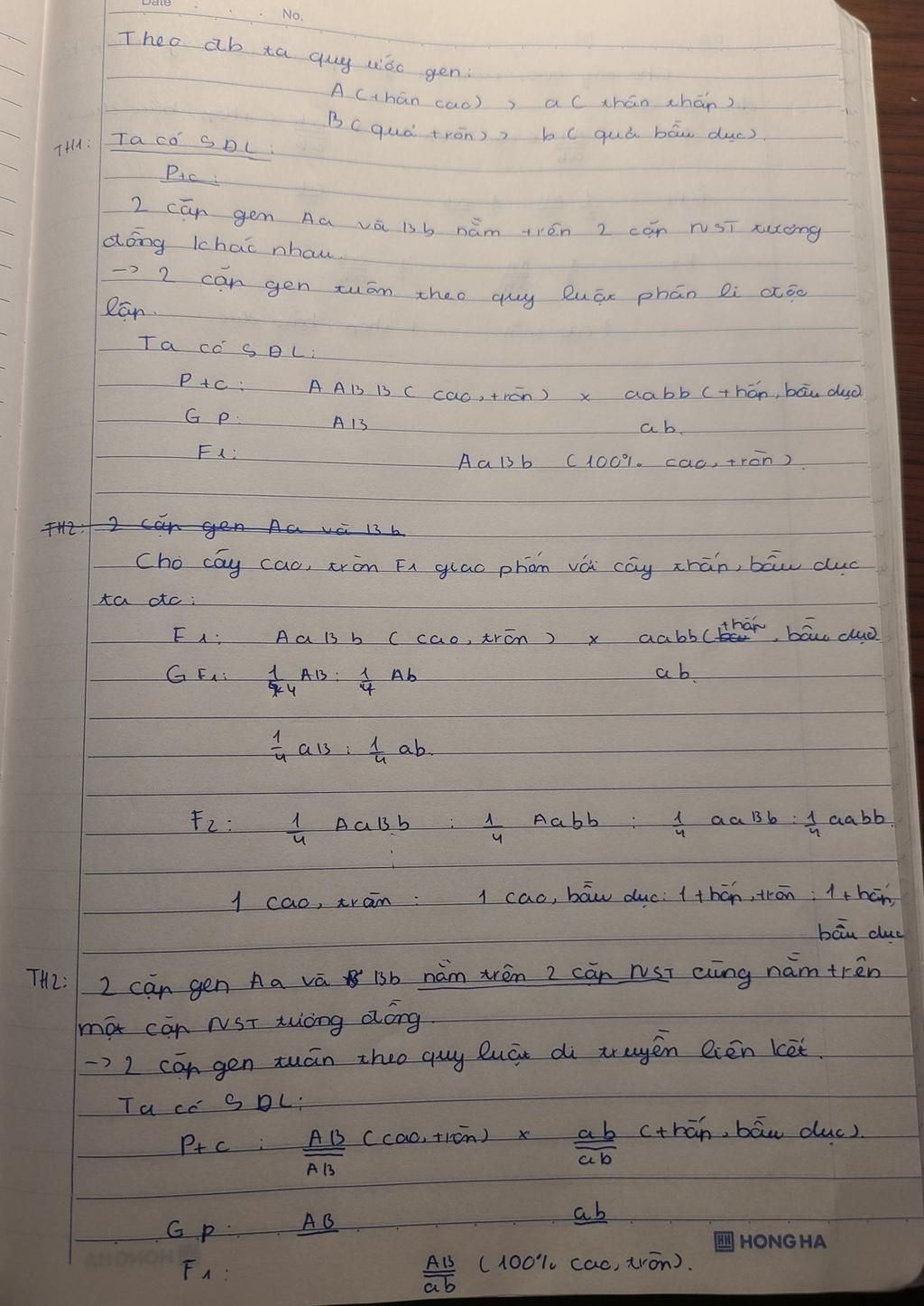 Th2 : 2 cặp gene Aa và Bb cùng nằm trên một cặp nhiễm sắc thể tương đồng