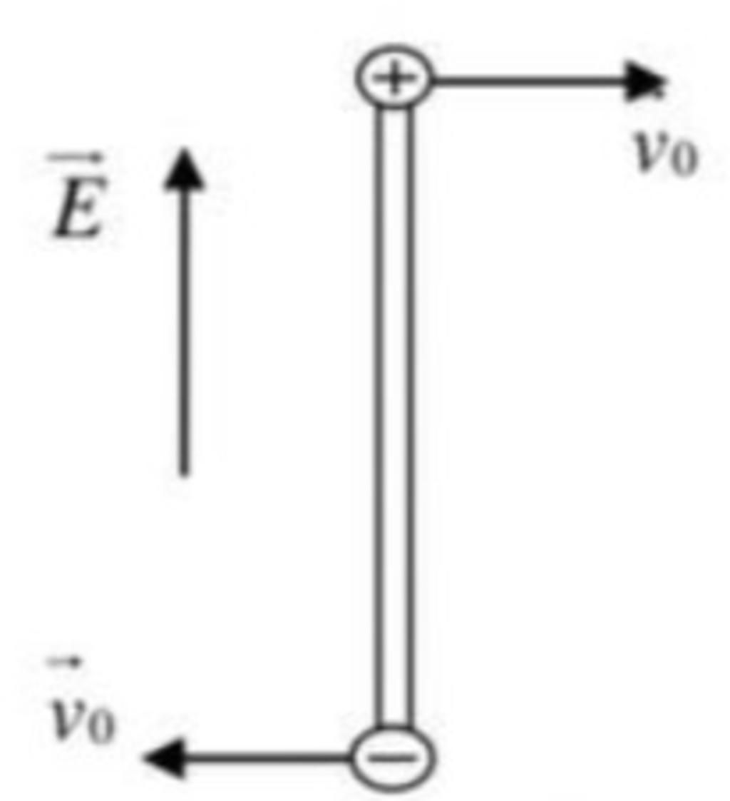 Hai quả cầu kim loại nhỏ có cùng bán kính và cùng khối lượng m = 5g được gắn vào hai đầu một thanh điện môi cứng, mảnh (khối lượng không đáng kể), dài l = 10m Tích điện cho hai quả cầu để chúng có điện tích q_{1} = q = 10 ^ - 7 C và q2= -q, rồi đặt chúng vào trong một điện trường đều Ẽ có cường độ E = 10 ^ 4 * V / m và có chiều hướng từ điện tích -q sang +q (hình vẽ). Người ta truyền đồng thời cho hai quả cầu cùng vận tốc v_{0} = 10m / s có chiều như trên hình vẽ. Hỏi khi đó thanh quay đi được một góc bằng bao nhiêu?