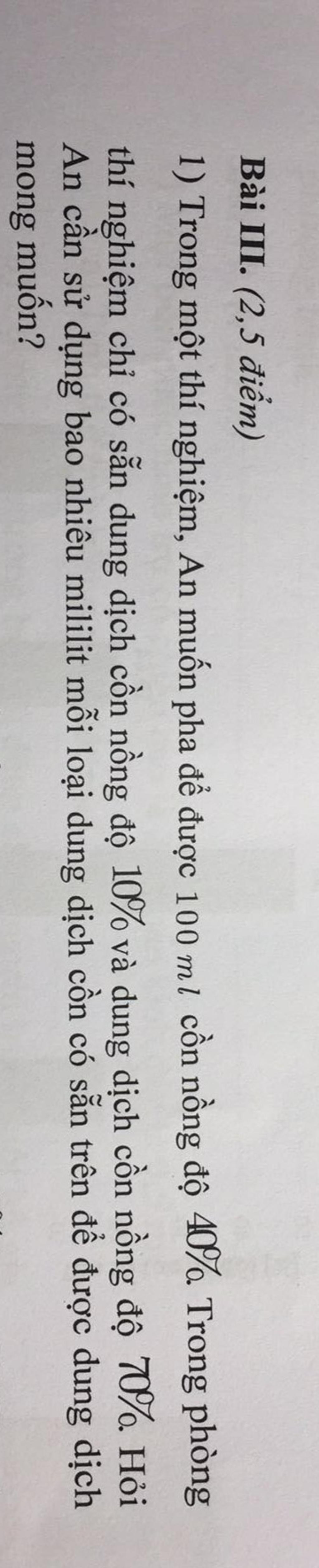 Với loại cồn `1` với nồng độ `10%` và nồng độ cồn loại `2` là `70%` thì pha được `100ml` cồn chứa nồng độ cồn là `40%`
