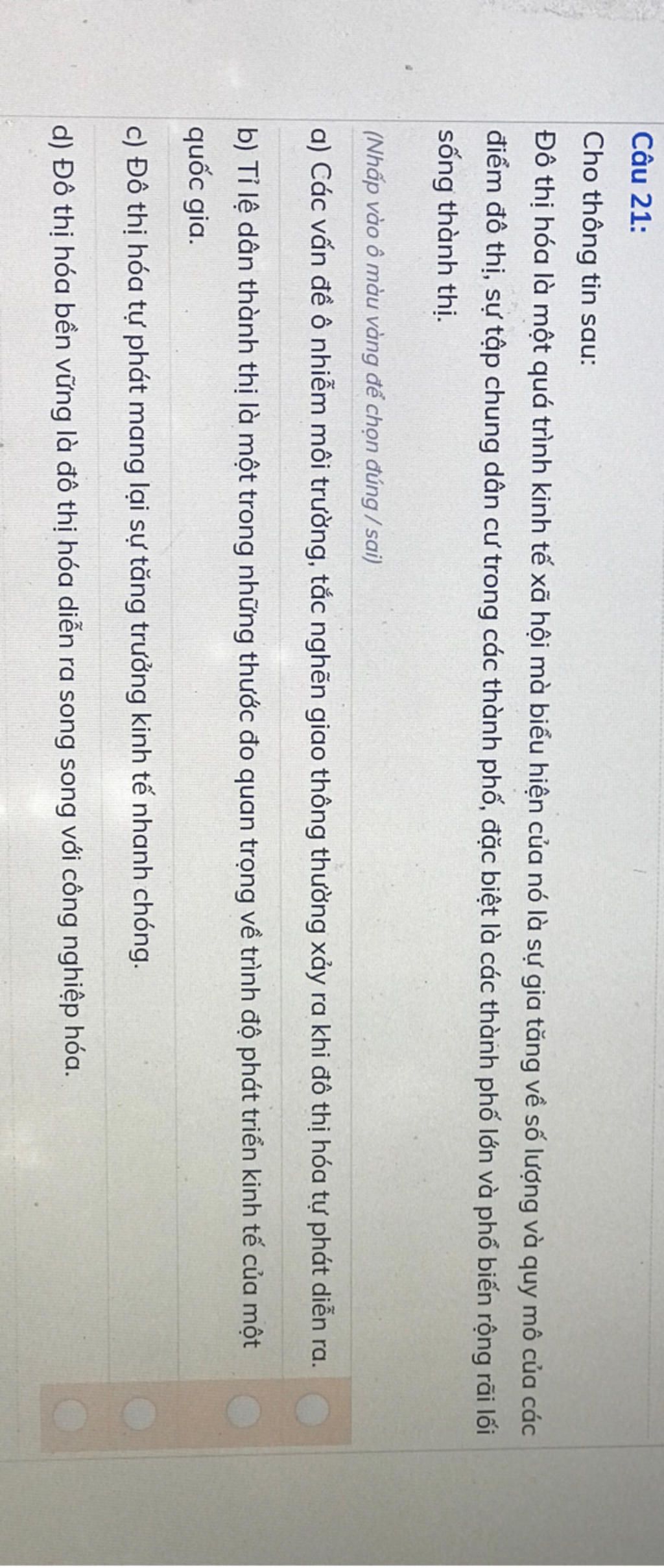 d) Đô thị hóa bền vững là sự tăng trưởng kinh tế diễn ra song song với công nghiệp hóa.