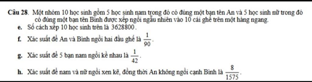 Số cách xếp để nam và nữ ngồi xen kẽ, đồng thời An không ngồi cạnh Bình là: `8 / 1575`
