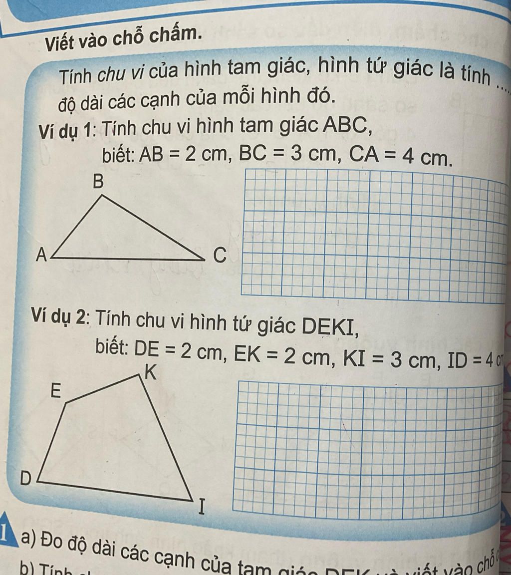 Câu hoàn chỉnh : Tính chu vi hình tam giác, hình tứ giác là tính tổng độ dài các cạnh mỗi hình đó