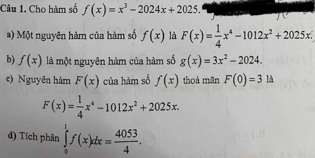 $\Rightarrow$ Một nguyên hàm của hàm số $f(x)$ là $F(x) = \dfrac{1}{4}x^4 - 1012x^2 + 2025x$