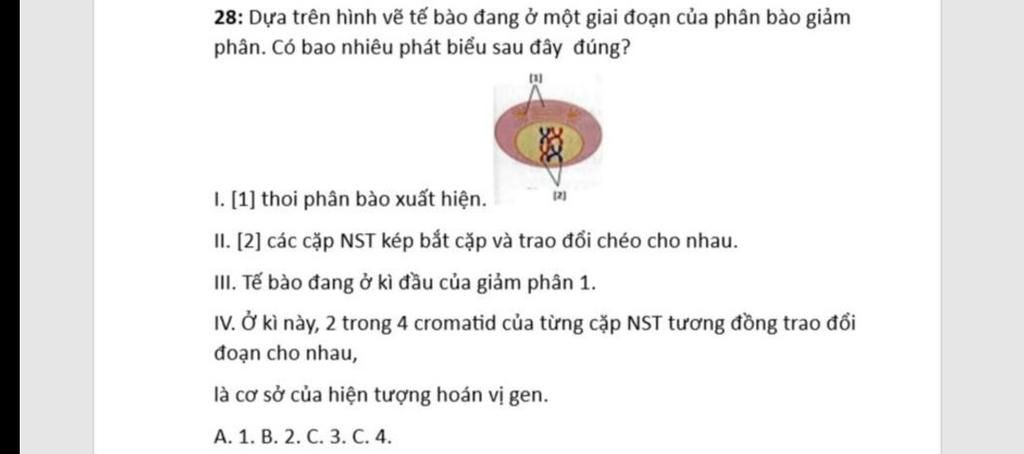 28: Dựa trên hình vẽ tế bào đang ở một giai đoạn của phân bào giảm