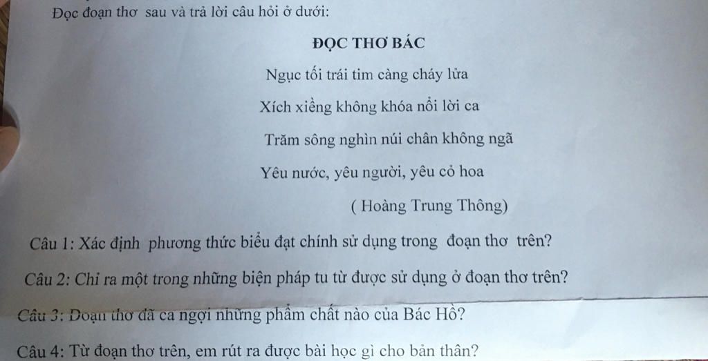 Đoạn văn trên sử dụng rất nhiều nghệ thuật tu từ đặc sắc nhưng em ấn tượng nhất với nghệ thuật nói quá của tác giả "Xích xiềng không khoá nổi lời ca/ Trăm sông nghìn núi chân không ngã", qua đó em thấy được cảnh tù ngục, bị khống chế, trong hoàn cảnh cổ đeo gông, chân vướng xiềng, dẫu có trăm sông nghìn núi thì tinh thần cách mạng trong Bác càng cháy bỏng, rực rỡ hơn. Câu thơ mang ý nghĩa sâu xa hơn khi trong lòng Bác trong hoàn cảnh nào cũng cháy lên cảm xúc thơ mãnh liệt, Bác không bao giờ bỏ cuộc dù có phải trải qua bao gian nan, thử thách khó khăn đi chăng nữa. Bằng nghệ thuật nói quá, Hoàng Trung Thông đã khẳn định tình cảm kính trọng, yêu thương đối với Bác và tình yêu quê hương dạt dào với dân tộc Việt Nam ta.