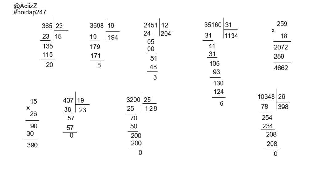 bài 1 đặt tính rồi tính 365:23 3698:19 2451:12 35160:31 259x18 15x26 437:19 3200:25 10348:26 97422:39 145x26 108x24
