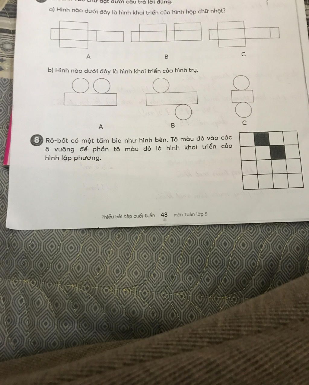 bài 7: ý a chọn A vì nó đủ hình để ghép thành hình hộp chữ nhật. không phải chọn hình B vì nếu ghép vào thì hình sẽ ko có đáy. ko phải C vì nó bị thừa.
