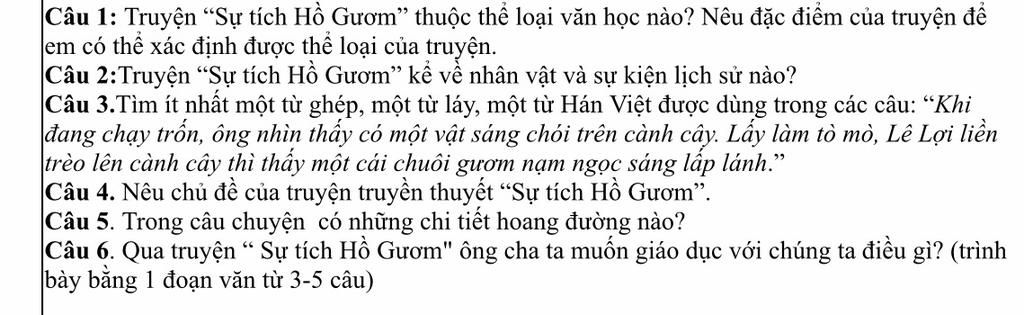 Câu2: Truyện kể về sự kiện Lê Lợi - vị vua sáng lập triều Lê - nhận được sự giúp đỡ của thần linh, đặc biệt là 1 con rùa thần, trogn cuộc kháng chiến chống quân xâm lược Minh.