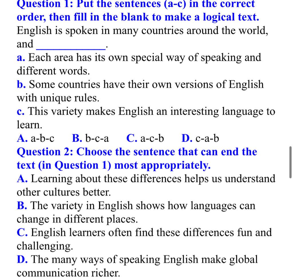 -> dịch: Tiếng Anh được sử dụng rộng rãi trong nhiều quốc gia trên thế giới và một số quốc gia có phiên bản tiếng Anh riêng với những quy tắc đặc trưng (b). Mỗi khu vực có cách nói riêng và sử dụng những từ khác nhau (a). Sự đa dạng này khiến tiếng Anh trở thành một ngôn ngữ thú vị để học (c).