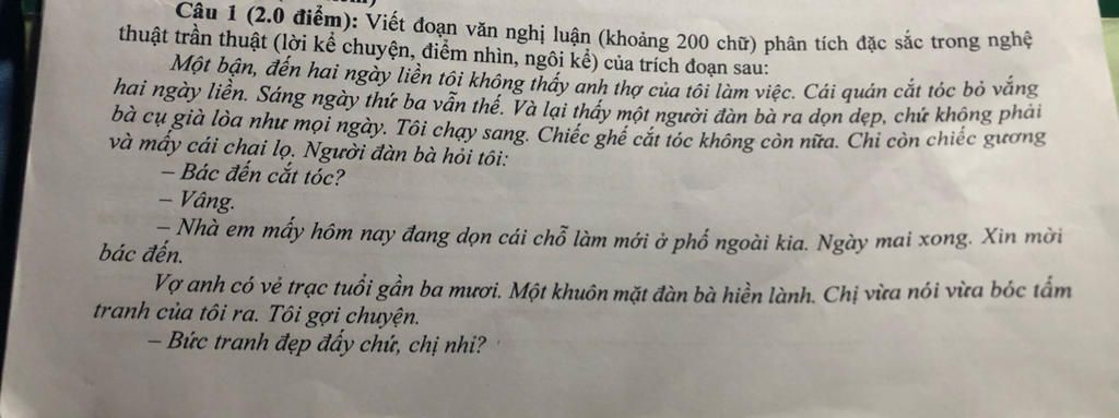 Trong đoạn trích trên nghệ thuật trần thuật được thể hiện rõ nét qua lời kể chuyện điểm nhìn và ngôi kể.Lời kể chuyện mang tính chất tự nhiên gần gũi giúp người đọc dễ dàng cảm nhận được không khí của câu chuyện.Nhân vật"tôi" là người kể chuyện thể hiện sự quan sát tỉ mỉ và cảm xúc chân thành khi thấy sự vắng mặt của anh thợ cắt tóc.Điểm nhìn của Nhân vật "tôi" không chỉ la 1 người khách đến cắt tóc mà còn là 1 người bạn tạo nên sự thân quen và gắn bó giữa các nhân vật.Ngôi kể là ngôi thứ nhất điều này giúp người đoc có thể tiếp cận sâu hơn vào tâm tư hình ảnh của nhân vật.Sự xuất hiện của người đàn bà dọn dẹp không chỉ làm thay đổi khônggian mà còn gợi mở nhiều suy nghĩ ề cuộc sống và sự thay đổi.Câu hỏi của nhân vật tôi"tôi" về bức tranh không chỉ đơ thuần là 1 câu hỏi giao tiếp mà còn thể hiên sự quan tâm à kết nối giữa các NV.Tất cả những yếu tố nay tạo nên 1 bức tranh sinh động về cuộc sốngsự giao tiếp và mối quan hệ giữa con người về cuộc sống sự giao tiếp và mối quan hệ giữa con người với nhau từ đó thể hiện sâu sắc tâm tư của nhân vật và những biển chuyển trong cuộc sống.