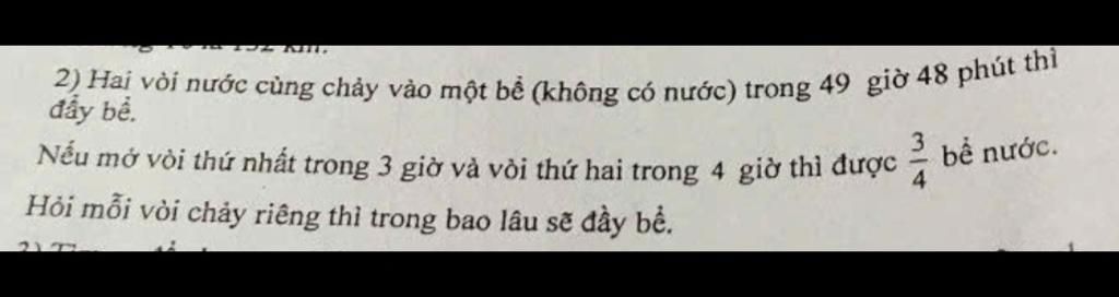 Gọi thời gian vòi 1 chảy một mình đầy bể là `a(h)`, thời gian vòi 2 chảy một mình đầy bể là `b(h)`