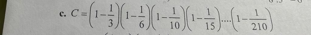 `c)C=(1-1/3)(1-1/6)(1-1/10)(1-1/15)*...*(1-1/210)`