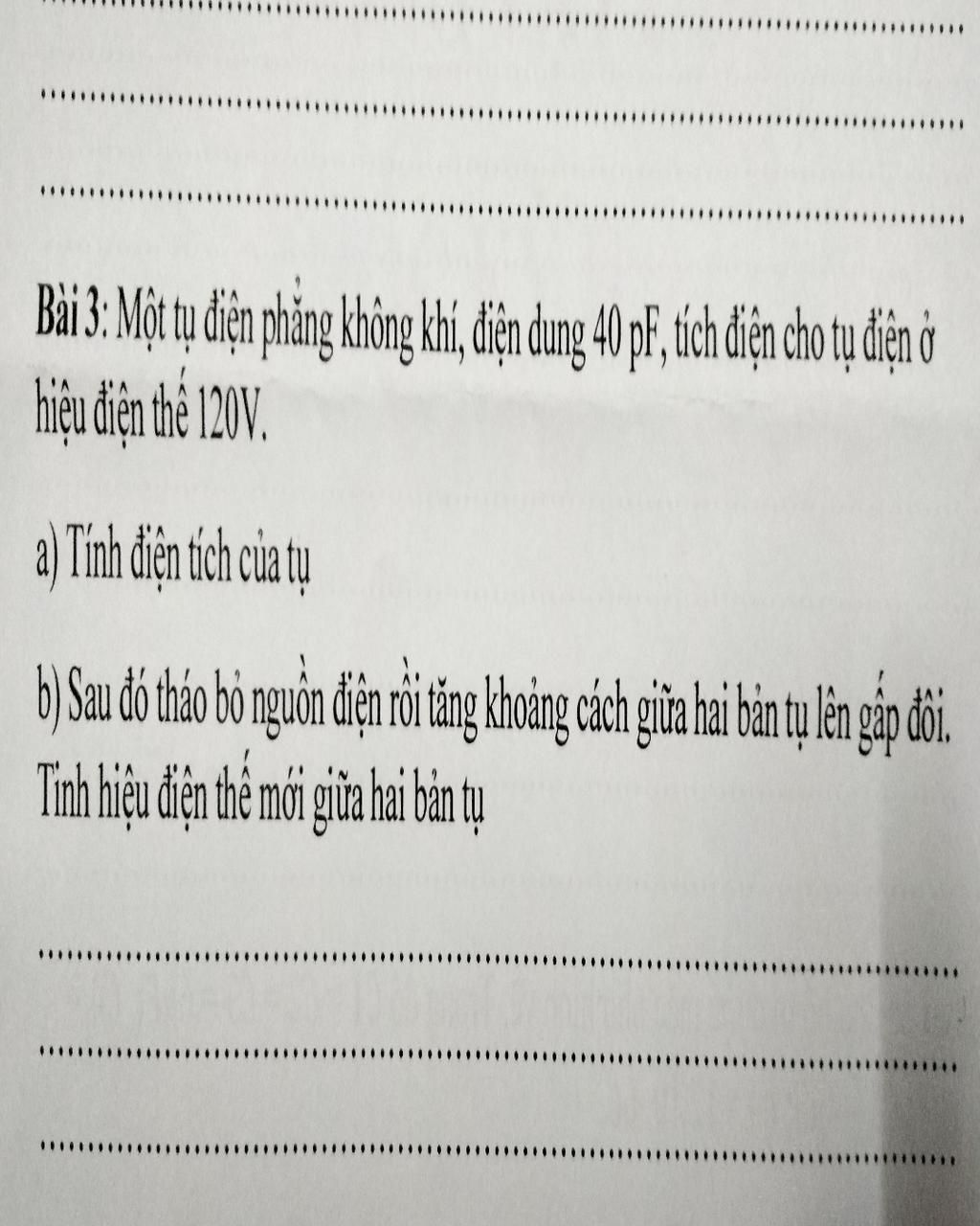 `a) Q = C.U = 40.10^(-6) . 120 = 4,8.10^(-3) (C)`
