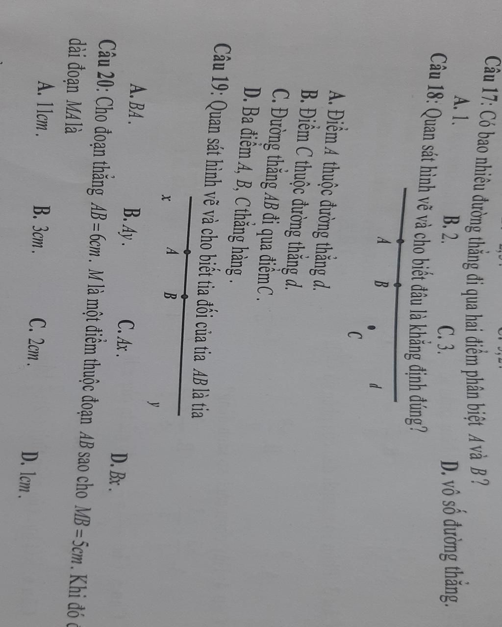 Câu 18:Điểm A,B thuộc d bởi điểm C ko nằm trên đường thẳng C