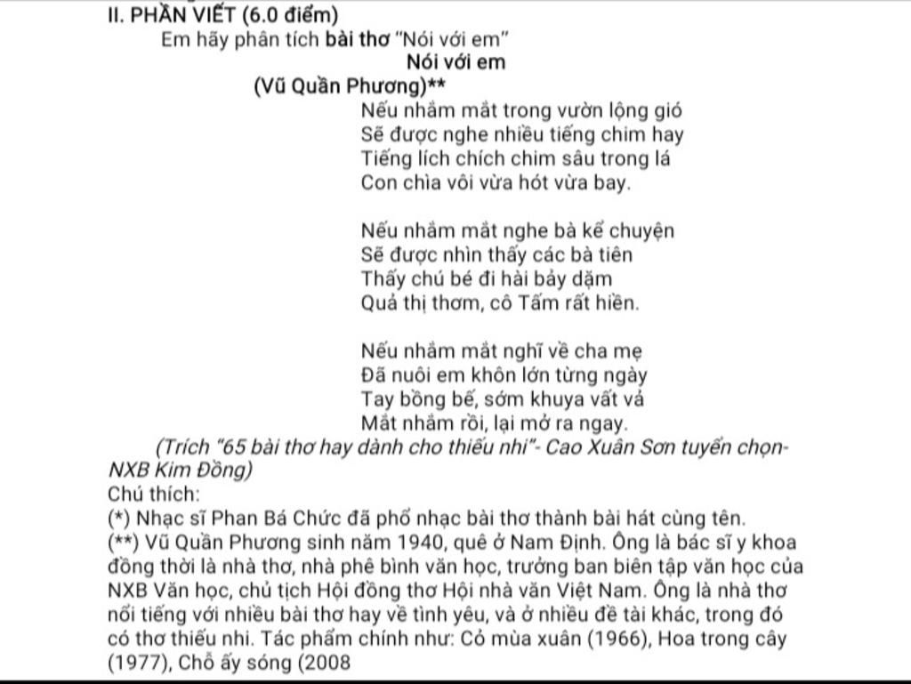 “Nói với em” là bài thơ giản dị, mơ mộng và tràn đầy tình yêu thương của nhà thơ Vũ Quần Phương dành cho nhân vật “ em”. Những vần thơ đơn sơ nhưng mang nhiều ý nghĩa sâu sắc đã giúp nó trở nên gần gũi và dễ tiếp cận hơn đối với đối tượng “ em” mà tác giả muốn hướng tới. Bài thơ mang đến một thông điệp ý nghĩa về việc biết trân trọng những điều bình dị, gần gũi xung quanh ta cũng như sự biết ơn, yêu thương đối với những người thân yêu của mình.