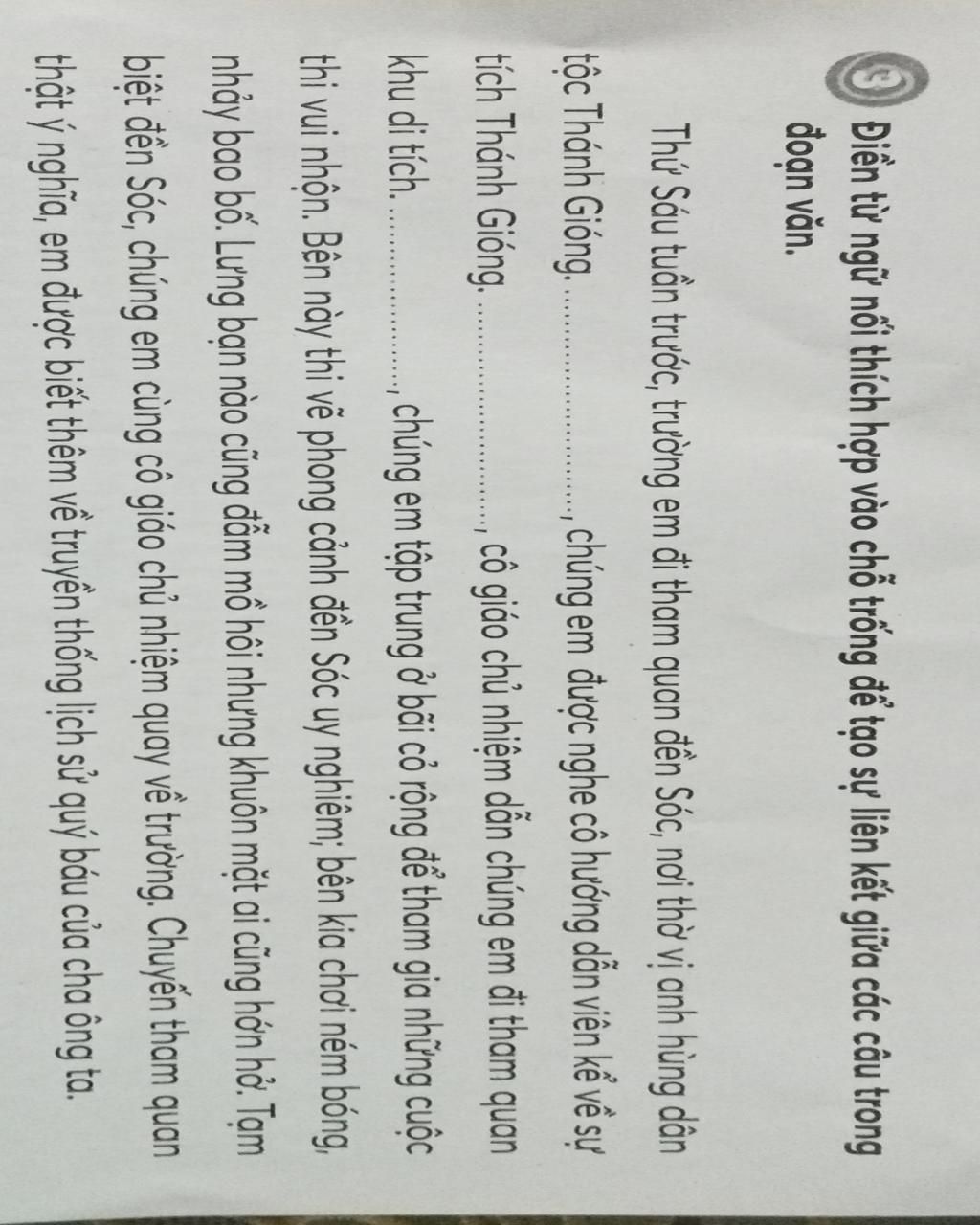 `->` Tiếp theo/ tiếp đó/ tiếp đến, cô giáo chủ nhiệm dẫn chúng em đi tham quan khu di tích.
