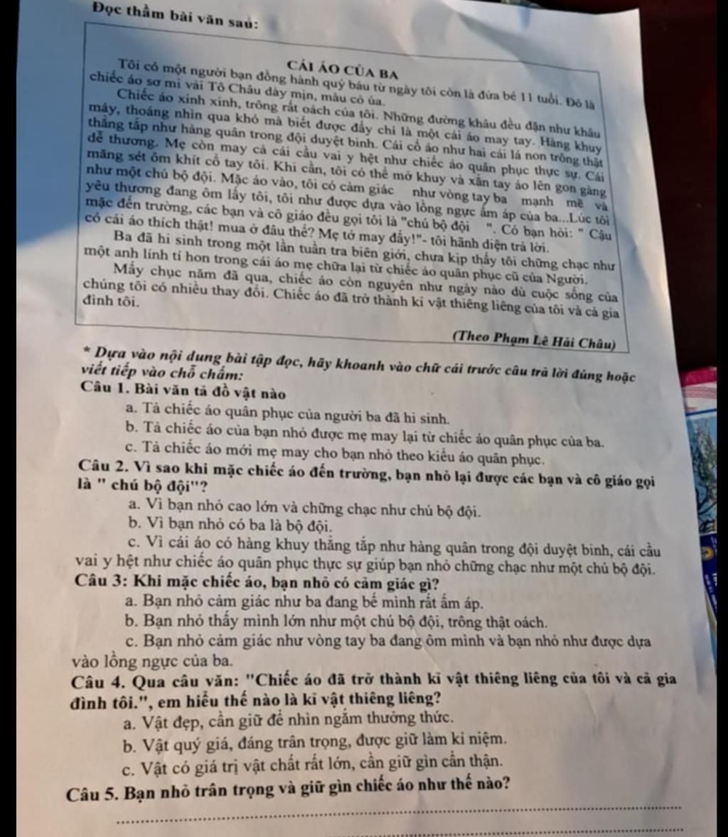 `->` Văn bản trên đã mô tả khá chi tiết và sâu sắc chiếc áo của bạn nhỏ được mẹ may lại từ bộ đồ quân phục của người cha đã hi sinh.