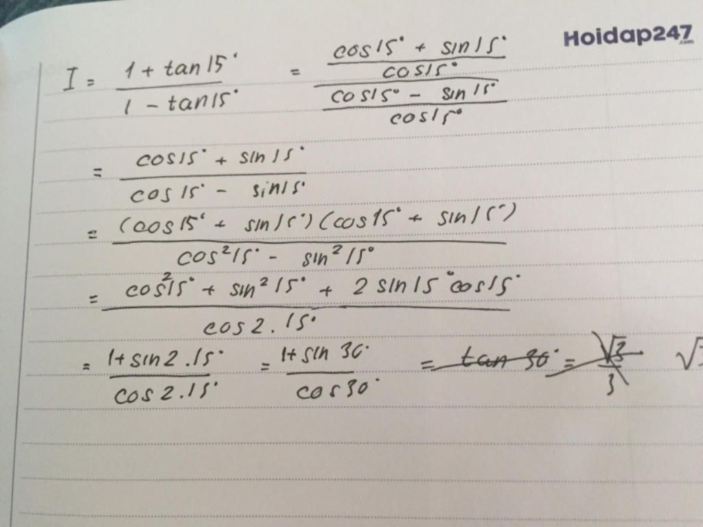I = \frac{{1 + \tan 15^\circ }}{{1 - \tan 15^\circ }} = \dfrac{{1 + \frac{{\sin 15^\circ }}{{\cos 15^\circ }}}}{{1 - \frac{{\sin 15^\circ }}{{\cos 15^\circ }}}} = \dfrac{{\frac{{\cos 15^\circ + \sin 15^\circ }}{{\cos 15^\circ }}}}{{\frac{{\cos 15^\circ - \sin 15^\circ }}{{\cos 15^\circ }}}}\\