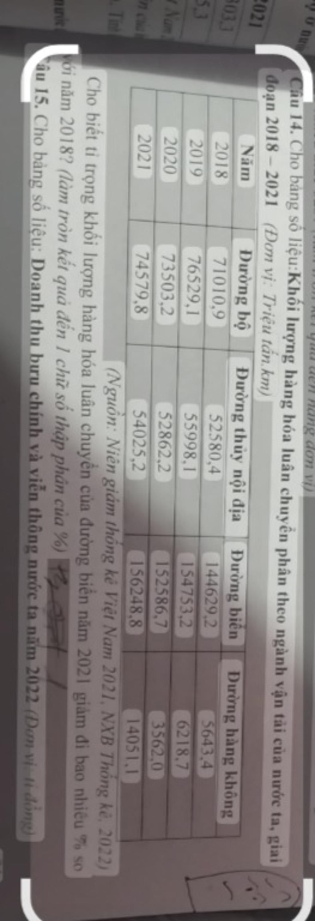 CT: $\rm{Tỉ\, trọng=\dfrac{\text{Giá trị thành phần}}{\text{Tổng giá trị}}\times100\text{(%)}}$$\\$ Ti trọng khối lượng hàng hóa luân chuyển của đường biển năm `2021` giảm so với năm `2018`:$\\$$\Bigg(\dfrac{144\,629,2}{71\,010,9+52\,580,4+144\,629,2+5643,4}\times100\Bigg)-\Bigg(\dfrac{156\,248,8}{74\,579,8+54\,025,2+156\,248,8+14\,051,1}\times100\Bigg)=0,5(\%)$