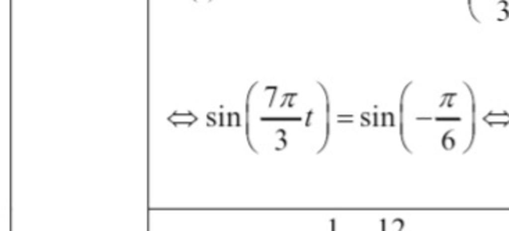 `Sin((7pi)/3 t)=Sin(-pi/6)`