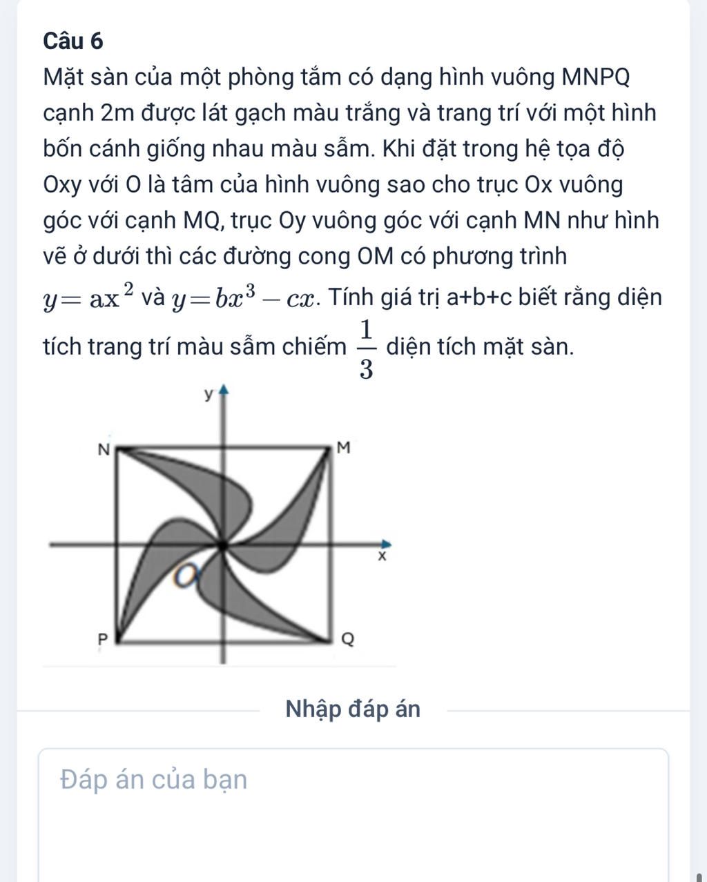 Mặt sàn của một phòng tắm có dạng hình vuông MNPQ cạnh 2m được lát gạch màu trắng và trang trí với một hình bốn cánh giống nhau màu sẫm. Khi đặt trong hệ tọa độ Oxy với O là tâm của hình vuông sao cho trục Ox vuông góc với cạnh MQ, trục Oy vuông góc với cạnh MN như hình vẽ ở dưới thì các đường cong OM có phương trình và . Tính giá trị a+b+c biết rằng diện tích trang trí màu sẫm chiếm