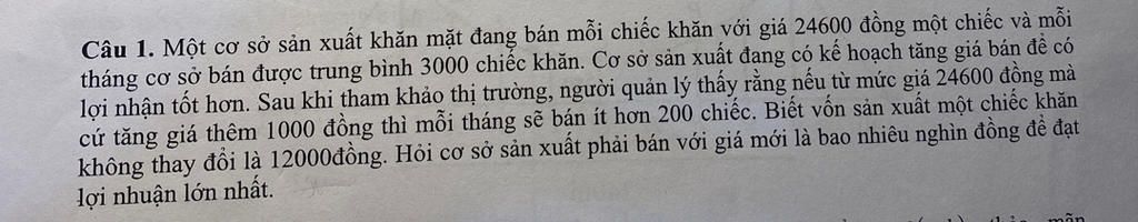 Câu 1. Một cơ sở sản xuất khăn mặt đang bán mỗi chiếc khăn với giá 24600 đồng một chiếc và mỗi