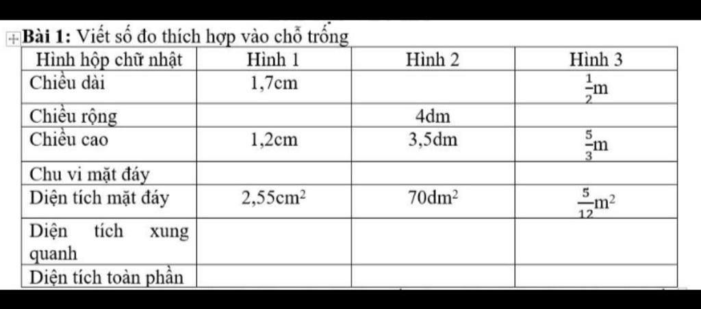 \begin{array}{|c|c|c|}\hline \text{hình hộp chữ nhật}&\text{hình 1}&\text{hình 2}&\text{hình 3}\\\hline \text{chiều dài }&\text{1,7 cm}&\text{17,5 dm}&\text{$\frac{1}{2}$m }\\\hline \text{chiều rộng}&\text{1,5 cm}&\text{4 dm}&\text{$\frac{5}{6}$m }\\\hline \text{chiều cao}&\text{1,2cm}&\text{3,5 dm}&\text{$\frac{5}{3}$ m}\\\hline \text{chu vi mặt đáy }&\text{6,4 cm}&\text{43 dm}&\text{$\frac{8}{3}$m }\\\hline \text{diện tích mặt đáy}&\text{2,55 cm²}&\text{70 dm²}&\text{$\frac{5}{12}$ m²}\\\hline \text{diện tích xung quanh}&\text{7,68 cm²}&\text{150,5 dm²}&\text{$\frac{40}{9}$m² }\\\hline \text{diện tích toàn phần}&\text{12,78 cm²}&\text{290,5 dm²}&\text{$\frac{95}{18}$m² }\\\hline\end{array}
