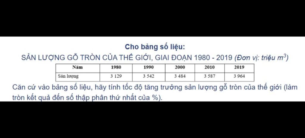 CT: Tốc độ tăng trưởng $=\dfrac{\text{Giá trị năm cuối}-\text{Giá trị năm đầu}}{\text{Giá trị năm đầu}}\times100$$\\$ Tốc độ tăng trưởng sản lượng gỗ tròn của Thế giới giai đoạn `1980-2019`:$\\$ $\dfrac{3\,964-3\,129}{3\,129}\times100\approx26,7(\%)$