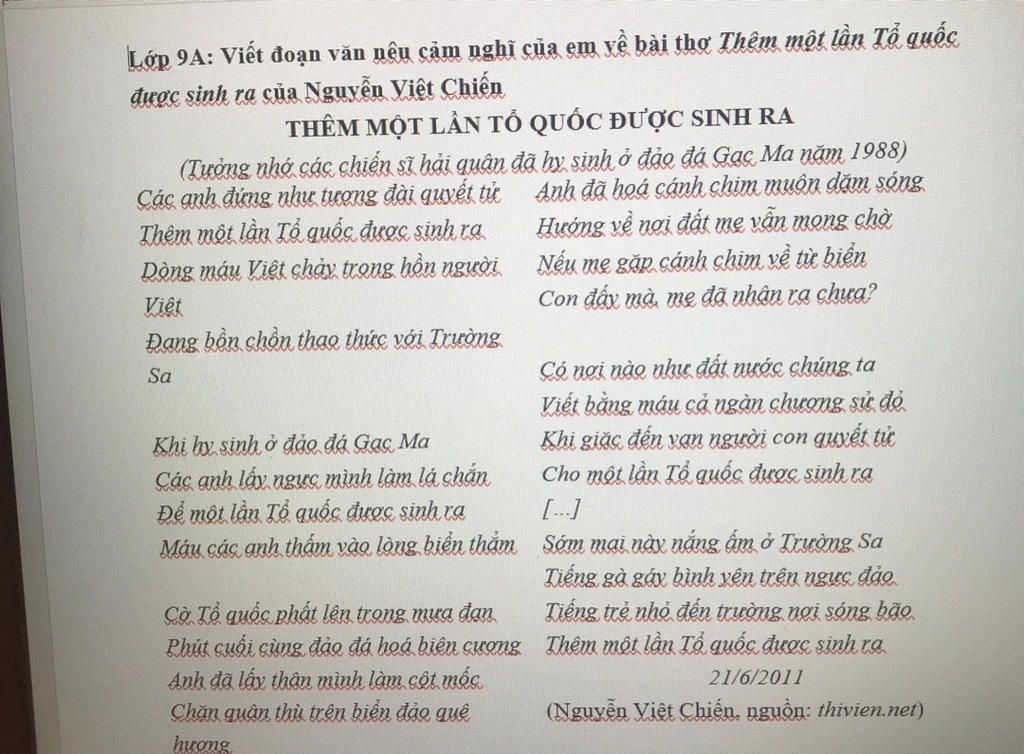 Bài thơ "Thêm một lần Tổ quốc được sinh ra" của Nguyễn Việt Chiến đã để lại trong em nhiều cảm xúc sâu sắc và lòng tự hào dân tộc. Bài thơ gợi lên hình ảnh những người chiến sĩ hải quân dũng cảm, kiên cường đã hy sinh anh dũng tại đảo Gạc Ma năm 1988. Họ đã lấy thân mình làm lá chắn, bảo vệ từng tấc đất thiêng liêng của Tổ quốc.