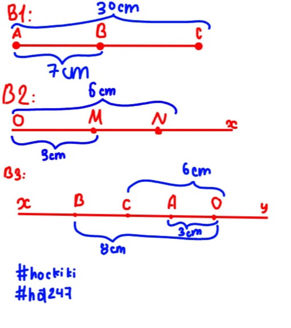 B1:Trên một đường thẳng : vẽ 3 điểm A,B,C sao cho AB=7cm, AC=30cm . hỏi điểm nào nằm giữa 2 điểm còn lại