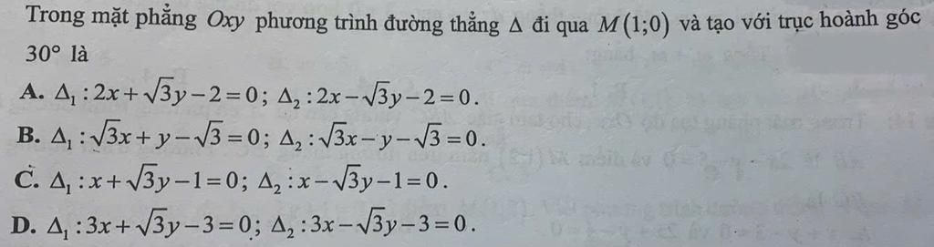 $\to$Hệ số góc là $k=\tan30^o=\dfrac1{\sqrt3}$ hoặc $k=\tan(180^o-30^o)=-\dfrac1{\sqrt3}$