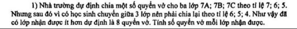 Vì số vở nhà trường dự định chia cho lớp `7A; 7B; 7C` tỉ lệ với `7;6;5`