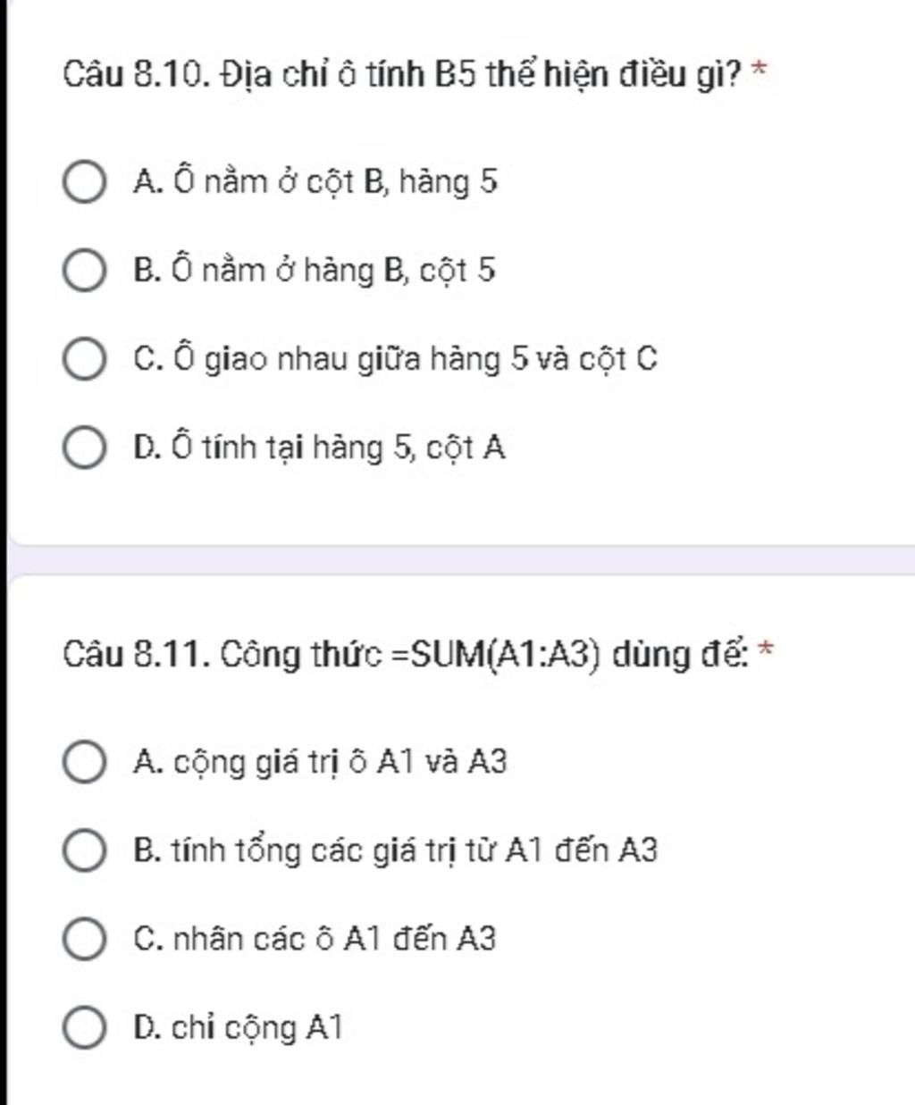 Câu 8.10. Địa chỉ ô tính B5 thể hiện điều gì? *