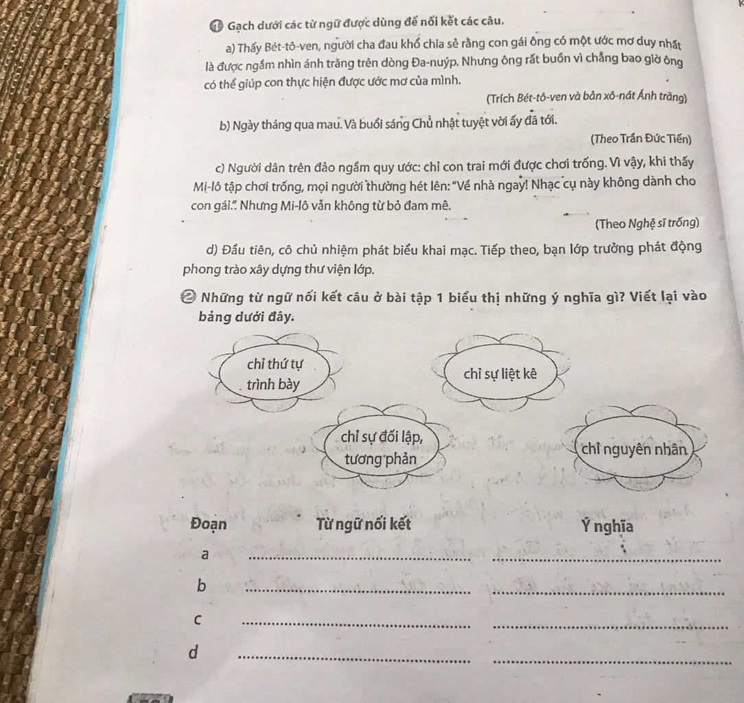 Gạch dưới các từ ngữ được dùng để nối kết các câu.